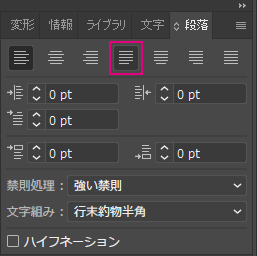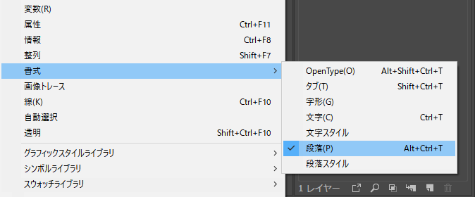 「ウィンドウ」>「書式」>「段落」で段落ウィンドウを開きます。