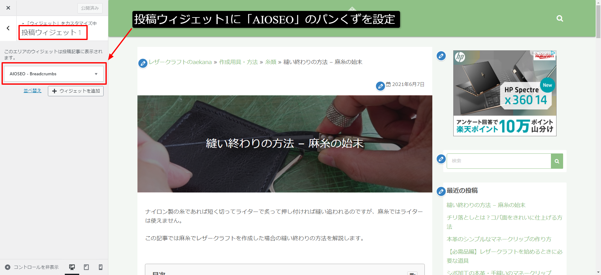 投稿ウィジェット1に「AIOSEO」のパンくずを設定して、